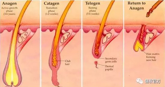 頭發(fā)有自己的生長(zhǎng)周期,最開始是好幾年的生長(zhǎng)期(anagen),然后是1-2周的退行期(catagen),到最后是1個(gè)多月的靜止期(telogen),然后就脫落了,再回到生長(zhǎng)期。