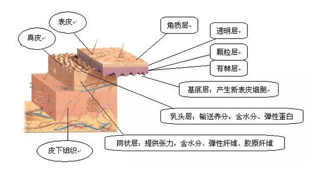 皮膚由表皮、真皮、皮下組織構(gòu)成,表皮又有角質(zhì)層~基底層等5部分構(gòu)成(透明層只存在手部和足部等)。
