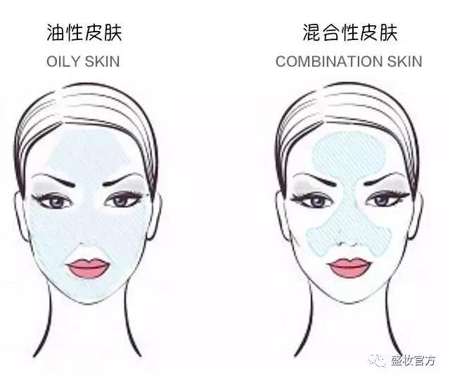 兼有油性皮膚和干性皮膚的兩種特點(diǎn),在面部T區(qū)(上圖右邊藍(lán)色區(qū)域)呈油性,其余部位呈干性或中性。我們大部分人都屬于這種類型!