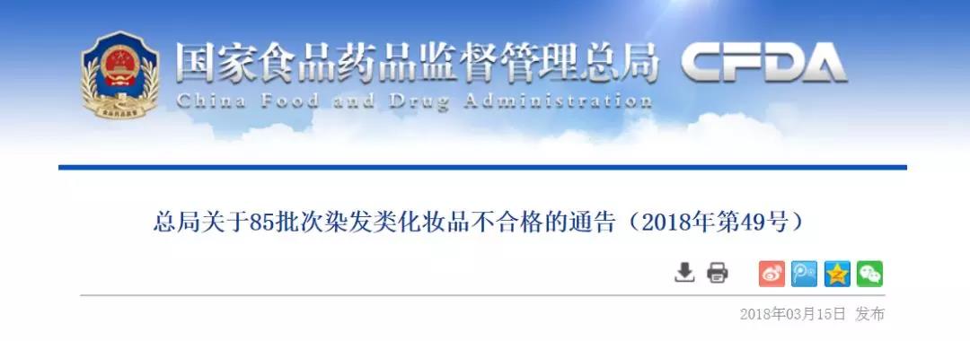 國家食品藥品監(jiān)督管理總局日前發(fā)布了《總局關(guān)于85批次染發(fā)類化妝品不合格的通告》(2018年第49號(hào))。