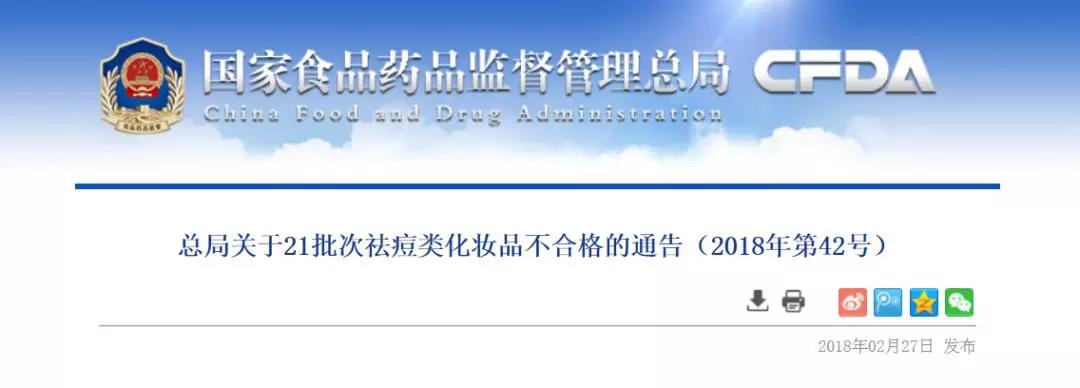 國家食品藥品監(jiān)督管理總局日前發(fā)布了《總局關(guān)于21批次祛痘類化妝品不合格的通告》(2018年第42號(hào))。
