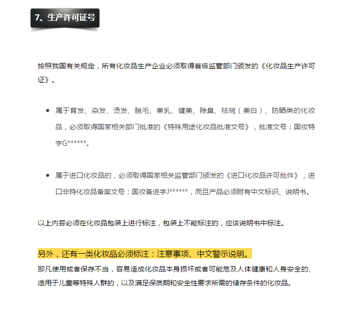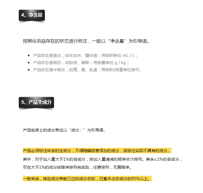 根據(jù)化妝品相關(guān)法規(guī)的要求,化妝品標(biāo)簽必須標(biāo)注以下內(nèi)容: