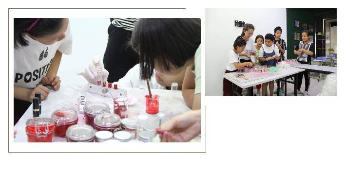 小朋友們仔細聆聽工程師的講解后,開始了口紅DIY,在燒杯中加入一定比例的基料(滋潤的油脂和蠟等原料),加入不同的色素,調(diào)配自己喜歡的顏色,攪拌并加熱到一定溫度后,倒入已準(zhǔn)備好的磨具,冷卻并脫模。