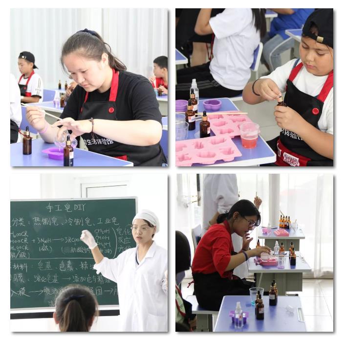 在盛妝制皂體驗室,備好了所需要的原材料和工具,同學(xué)們基本了解了制皂原理后,開始DIY自己心儀的手工皂。市面上有各種顏色、各種形狀的手工皂,看起來制作簡單,這其中還有很多要注意的地方,比如原料配比、溫度控制等,考驗和考察著同學(xué)們的相關(guān)知識和計算。