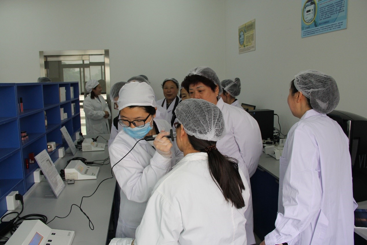 北京盛妝家化有限公司的領(lǐng)導(dǎo)和員工熱情接待了參觀團一行人并帶領(lǐng)參觀人員觀摩了工廠。在專人的引領(lǐng)下,會員們參觀了位于工廠一層的彩妝、制造、包裝等車間,身臨其境的體驗了化妝品生產(chǎn)全過程;并認(rèn)真的了解了位于二樓的質(zhì)量品控中心的產(chǎn)品質(zhì)量控制流程,知道了一瓶合格化妝品的檢驗過程。在三層的功效評價中心幾位會員隨機體驗了皮膚水分測試儀以及黑色素和血紅素測試儀,會員們分別使用了盛妝不同的產(chǎn)品進行了使用前后的對比和分析,得到了科學(xué)的產(chǎn)品數(shù)據(jù),從而對相關(guān)產(chǎn)品非常滿意。