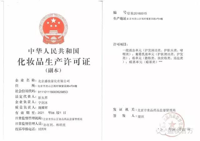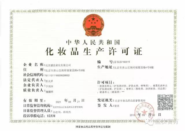 北京盛妝家化有限公司新版化妝品生產(chǎn)許可證(包括正本和副本首頁)見下圖: